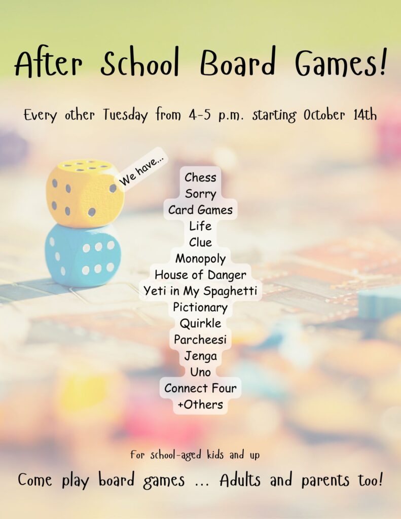 Attention board game buffs! A new group is happening at the Muncy Public library every other Tuesday. You can call to register for this program, or just stop in after school! We will be playing a variety of games based off of participants’ interests.